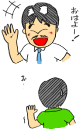夏休み中に会わなかった子もいるので、知らん顔をして教室に「おはようございます!」と入っていくと子どもたちはドッと・・・わかないんですねぇ。これが。なにか奇妙なものを見つけてしまったような顔をして、しばし動きが止まるのです。そして、何も見なかったかのようにしています。