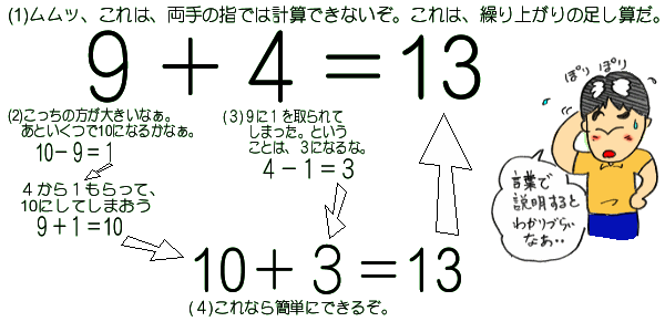 「10+3」の計算をして、答えは「13」。それが「9+4」の足し算の答えとなります。