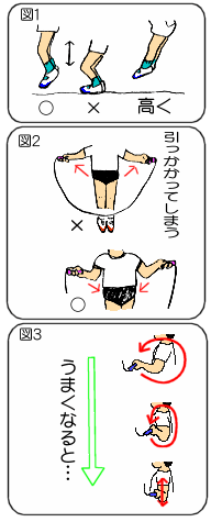 特に(1)のポイントは重要で、このことに注意させるとリズムよく跳べるようになります。また、上達の具合は、手の動きでわかります。最初は円を描いていた手が、上手になってくると縦の楕円運動になり、更には、上下運動になります。(図3)